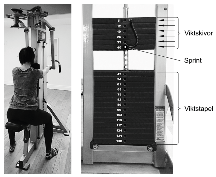 Lena tränar på gym och använder en maskin för att träna ryggen. Genom att stoppa in en sprint i en viktskiva på maskinens viktstapel kan hon välja den totala vikt hon vill använda. Se bilderna.
