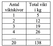 Låt $y$y vara den totala vikten i kg som Lena använder och $x$x antalet viktskivor som hon väljer i viktstapeln.