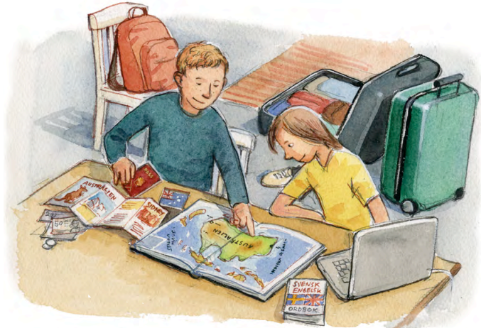 Du kommer att få möta Leo och Maja som är syskon. De ska snart åka med sina föräldrar till Australien för att hälsa på sina kusiner. De är förstås nyfikna och vill veta mer om Australien. De tittar på kartor, läser böcker och på nätet och hittar både rolig och intressant fakta om landet, om kända platser och om djur som finns där.