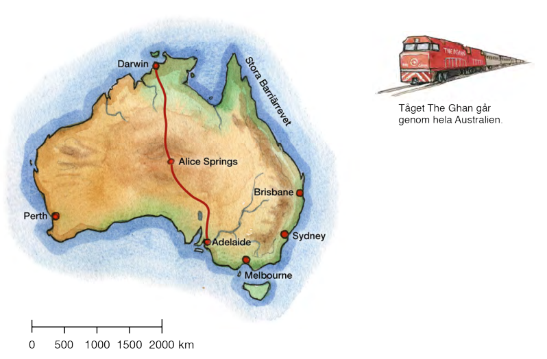 a) Ungefär hur lång är tågsträckan mellan Darwin och Adelaide i verkligheten?