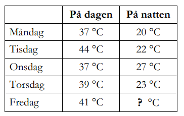 Visa hur du löser uppgiften.b) Medelvärdet för temperaturen på natten var $24\text{ }^{\circ}$24 ∘C.