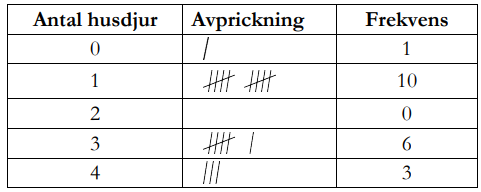 Simon har undersökt hur många husdjur klasskamraterna har.Så här ser hans tabell ut.