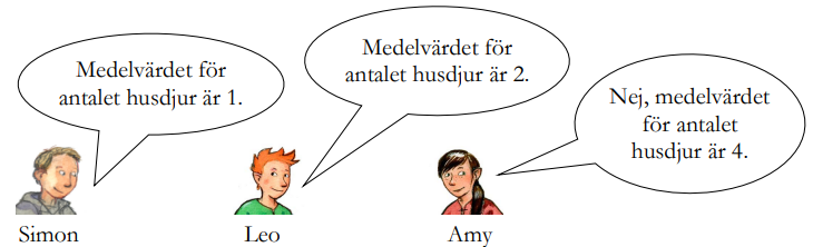 Skriv bara svar.b) Simon, Leo och Amy ska bestämma medelvärdet för antalet husdjur per elev.