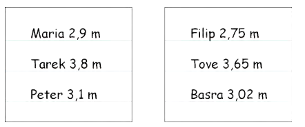 Skriv upp alla resultat i ordning, det kortaste längdhoppet först.
