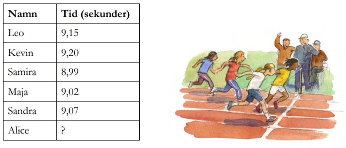 a) Vem sprang på $9$9 sekunder och $2$2 tiondelar?