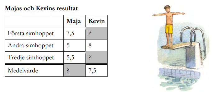 b) Kevins medelvärde är $7,5$7,5 poäng. Vilka poäng kan Kevin ha fått i sitt första och tredje hopp? Undersök vilka lösningar det finns och ge flera förslag.