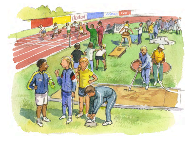 gymnastik, cykel, längdhopp, springa $60$60 m och simhopp.