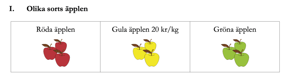 Visa hur du löser uppgiften.b) Här ser du en tabell som hör till de gula äpplena. Fyll i tabellen.