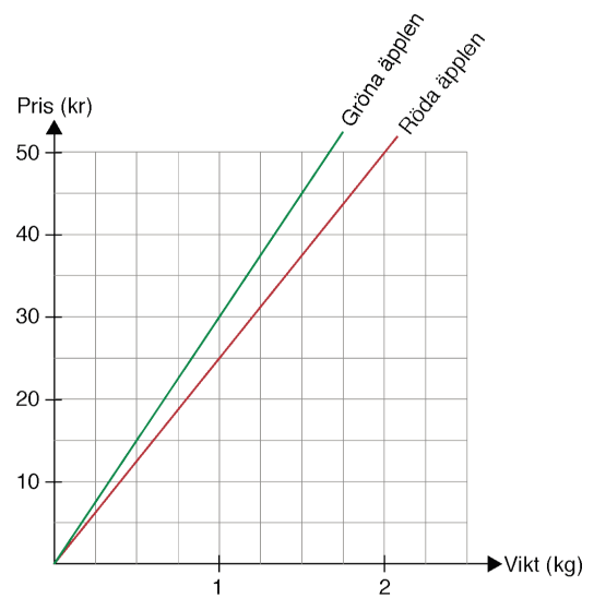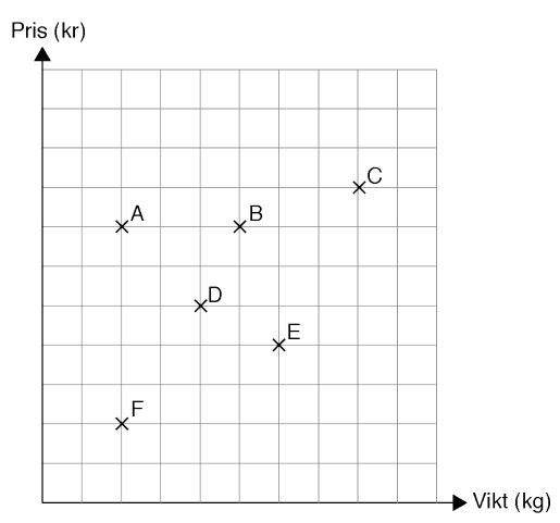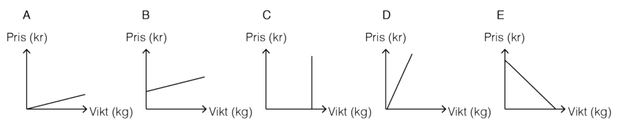 Förklara hur du med hjälp av diagrammet kan veta det.c) Påse G har samma pris per kilogram som påse A, men den väger mer. Skriv ett G för påse G i diagrammet. Förklara varför du skriver G just där.