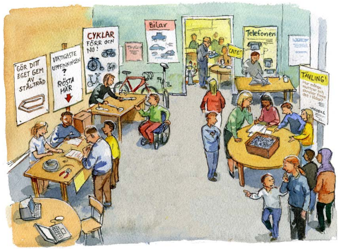 Vid ett bord får besökarna prova att göra gem av en lång ståltråd. Vid ett annat bord får de gissa hur många muttrar, skruvar och bultar det är i en stor låda.