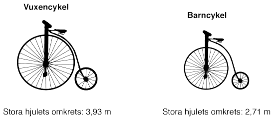 Samira trampar $50$50 gånger på en vuxencykel och Viktor trampar $50$50 gånger på en barncykel. Hur mycket längre kommer Samira på vuxencykeln jämfört med Viktor på barncykeln?