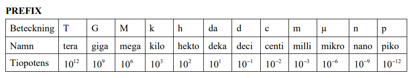 Det skulle dock vara väldigt opraktiskt att alltid använda SI-enheterna som de är, t ex är ju enheten sekunder väldigt liten när jordens omloppstid kring solen ska anges. I detta fall kan vi använda ett prefix tillsammans med enheten. Nedan ser du en sammanställning av de vanligaste prefixen som används på gymnasiet, hämtad från Skolverkets formelblad för NP i matematik: