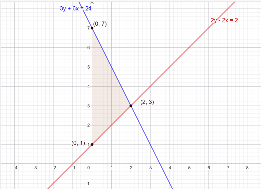 De två linjerna $2y-2x=2$2y2x=2 och $3y+6x=21$3y+6x=21 skapar en triangel tillsammans med $y$y-axeln. Bestäm de exakta koordinaterna för triangelns hörn.