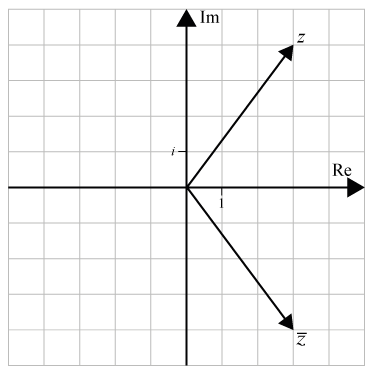 Om ett komplext tal  $z$z  och dess konjugat  $\overline{z}$z  ritas i det komplexa talplanet kommer  $z$z  och  $\overline{z}$z  vara varandras spegelbilder på varsin sida om den reella axeln. Detta gäller när talen representeras av punkter, och när de representeras som vektorer.