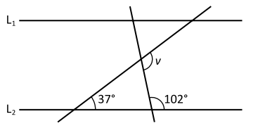 Linjerna L$_1$1 och L$_2$2 är parallella. Hur stor är vinkeln $v$v?