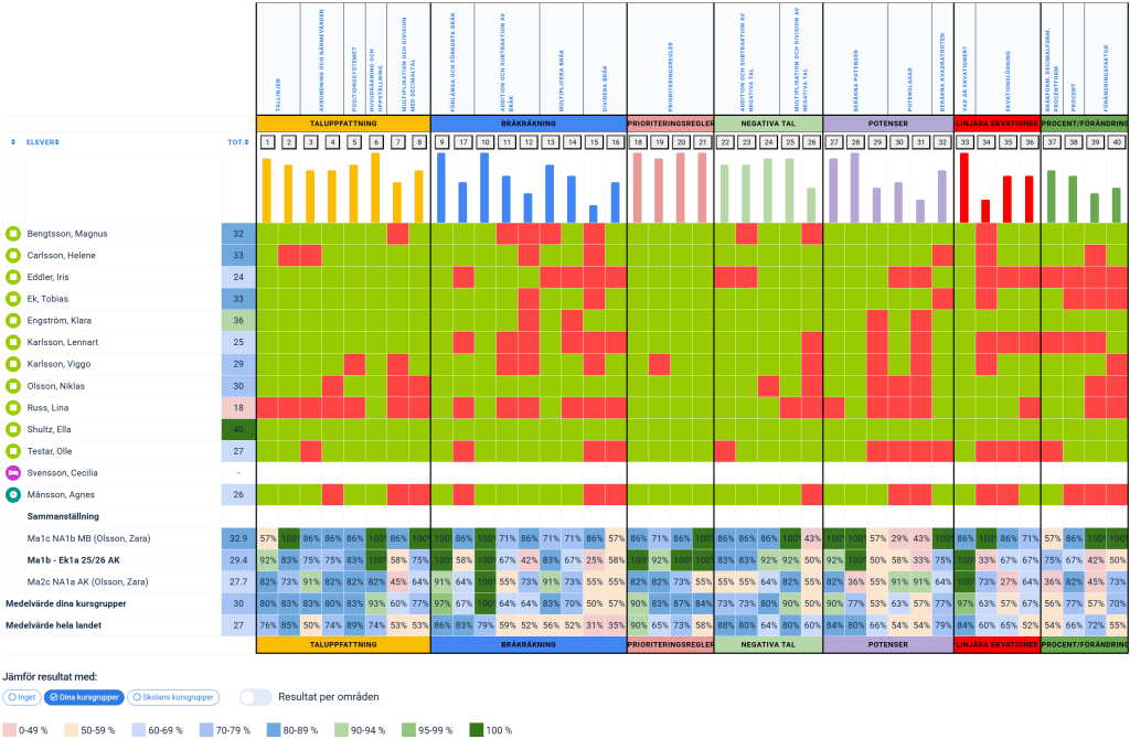 Resultaten kan jämföras med andra kursgrupper på din skola samt med resultat för alla som genomfört Eddlers Förtest på uppgiftsnivå i olika diagram
