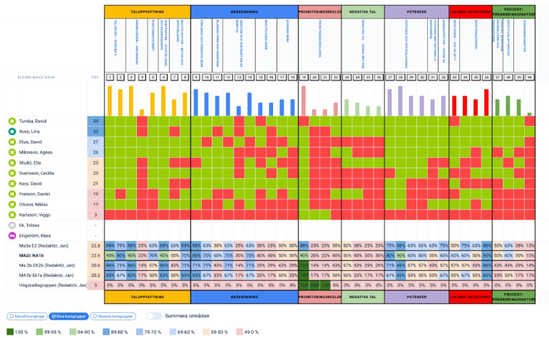 Läraren kan följa elevernas arbete med uppföljningsmaterialet. Lila rutor motsvarar innehåll eleven vid testet inte visat tillräckligt god kunskap kring. De lila rutorna fylls med grönt allt eftersom att eleven ser videos och löser uppgifter.